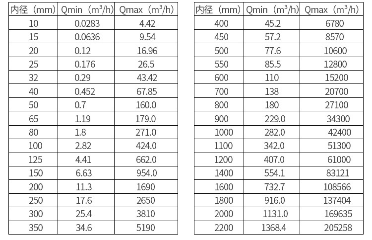 dn100電磁流量計(jì)測(cè)量范圍流量范圍參考: